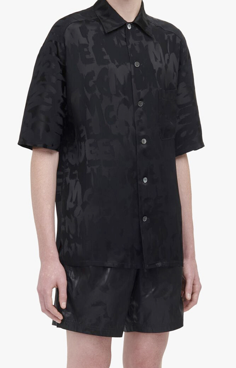 This shirt and short are not actually sold as a set but I suggest buying them both for a fierce look. Black on Black graffiti print on a heavy almost upholstery type silky fabric. Think glam rocker in shorts. They are very cool.